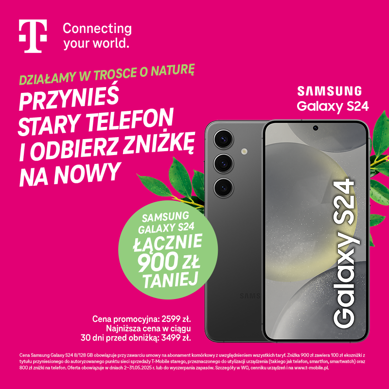 Działamy w trosce o naturę. Przynieś stary telefon i odbierz zniżkę na nowy. Teraz Samsung Galaxy S24 łącznie 900 zł taniej. Oferta ważna do 31.05.2025 r.
