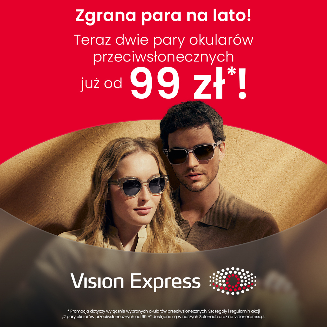 * Promocja dotyczy wyłącznie wybranych okularów przeciwsłonecznych. Szczegóły i regulamin akcji „2 pary okularów przeciwsłonecznych od 99 zł” dostępne są w naszych Salonach oraz na visionexpress.pl.