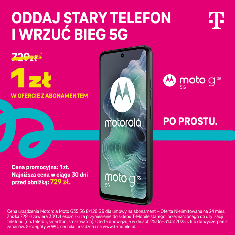Motorola Moto G35 5G 8/128 GB za 1 zł w ofercie na abonament. Po Prostu! Oferta obowiązuje do 31.07.2025r. lub do wyczerpania zapasów. Zapraszamy do sklepu T-Mobile.